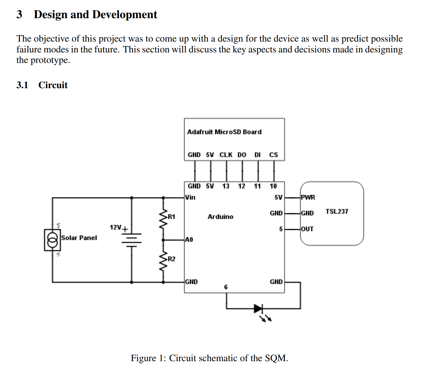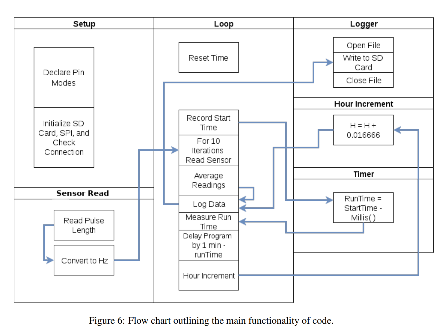 I built the prototype by water-proofing Folgers coffee can, housing a TSL237 light to frequency converter and Arduino. The prototype was powered by a small lead acid battery which was charged by a recreational solar panel I found laying around my apartment. Data was logged and stored via a microSD card. Below are a simplified circuit schematic and block diagram of the code.