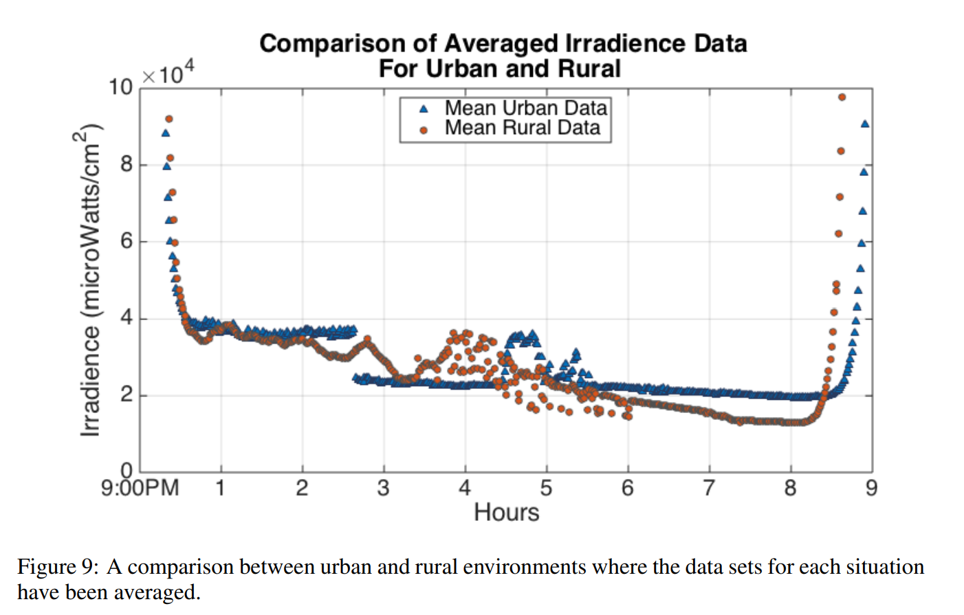 I am not sure what the faculty took from this data, but I remember being surprised at how similar the two locations were. The features in the data could be explained by the moon coming out from behind trees in the urban setting, and clouds rolling in on the night of the rural setting.