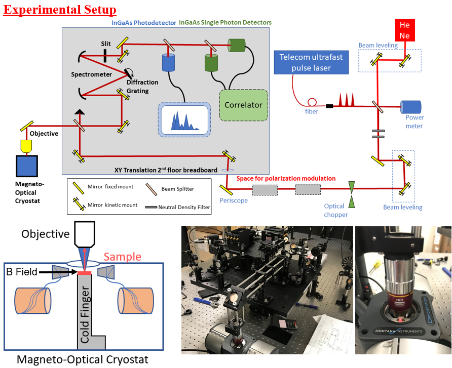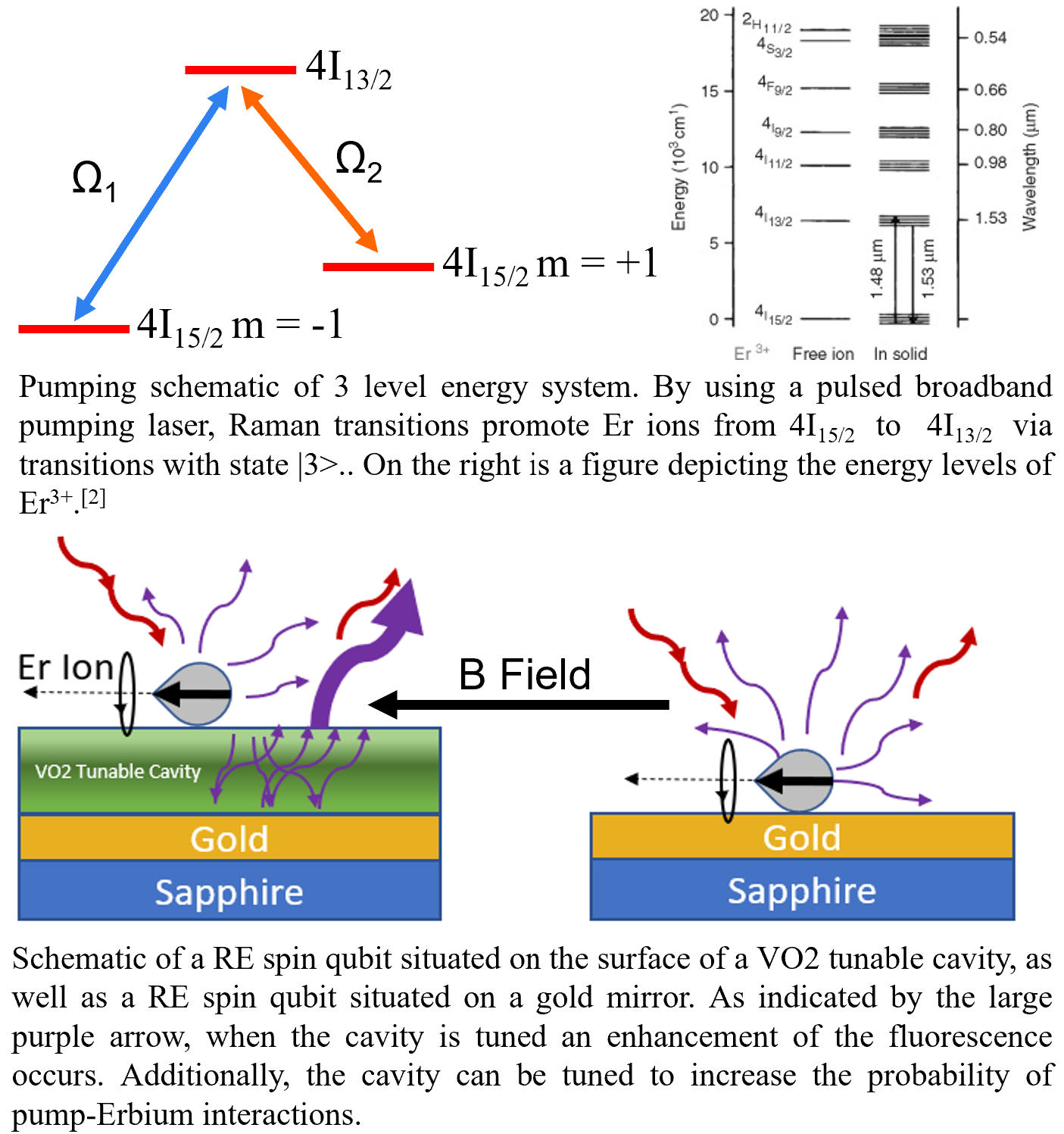 Here’s how the physics works: Quantum optical sensors push beyond classical limits by leveraging detectors with extremely high quantum efficiency, enabling measurements that beat the shot-noise limit and reveal sub-Poissonian photon statistics. If we could use the photo-luminescent signal from an ensemble of erbium ions to identify single-ion emission through photon antibunching, we would have a way to isolate individual qubits. The performance of each qubit is strongly influenced by its local environment. Under an external magnetic field, we used a pulsed broadband laser at 1536 nm to drive transitions between two electronic states of the erbium ion: the ground state and a metastable excited state. A portion of the resulting fluorescence was collected by a microscope objective and passed through a Czerny-Turner monochromator. By scanning the diffraction grating and detecting the optical power with an InGaAs detector and lock-in amplifier, we obtained emission spectra. Fluorescence lifetimes were measured using single-photon counting in zero field. To measure spin coherence times (T₂), we implemented a spin echo protocol by modulating the laser phase and detecting correlated photon arrival times across two detectors. If successful, we could try to enhance signal collection by placing the ions on a thermally tunable VO₂ cavity, which could tune the light-qubit coupling and provide some means of control over the system.